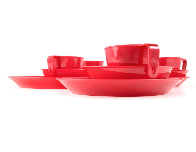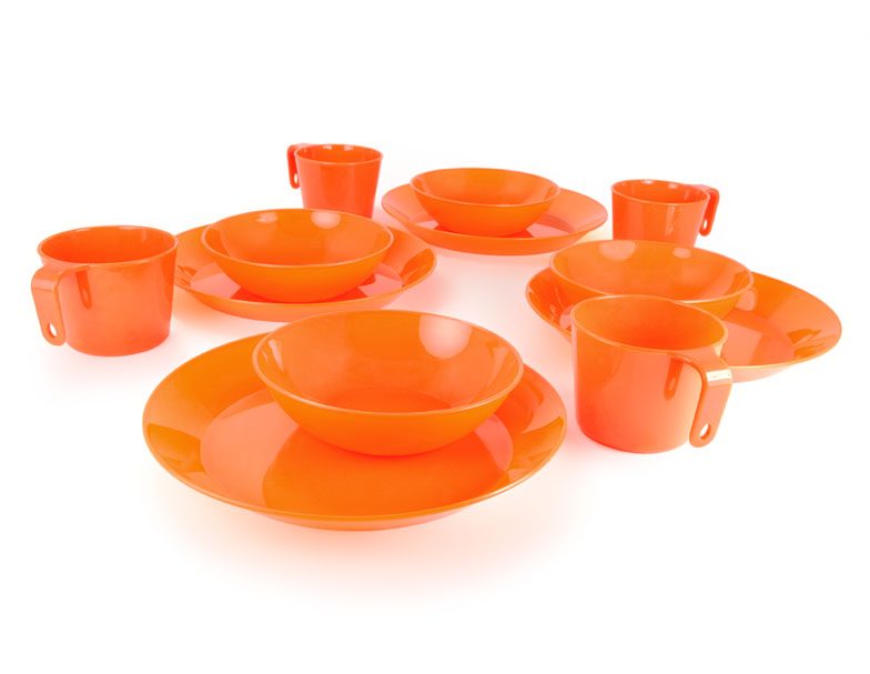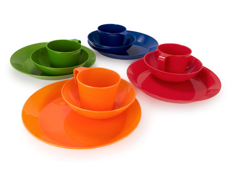 Комплект составляют четыре кружки, четыре миски, четыре тарелки из экологически чистого полностью перерабатываемого полипропилена серии Cascadian.